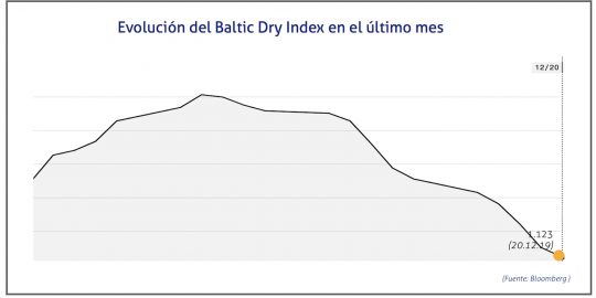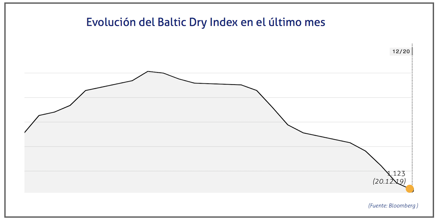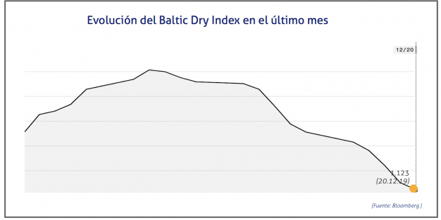 El Baltic Dry Index, BDI, que refleja los precios de los fletes de los buques graneleros tomando como referencia un total de 23 rutas marítimas, se ha situado el viernes 20 de diciembre de 2019 en los 1.123 puntos, lo que supone una caída de 28 puntos o del 2,43%.
