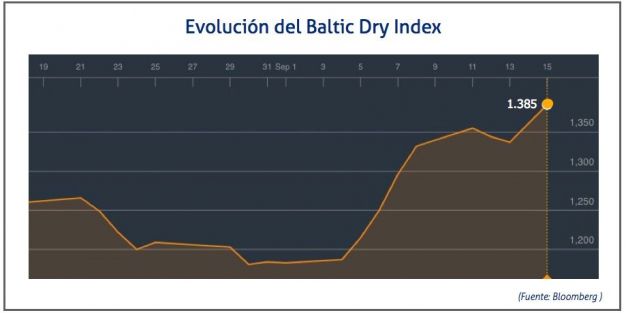 El Baltic Dry Index, BDI, que refleja los precios de los fletes de los buques graneleros tomando como referencia 23 rutas marítimas, ha llegado el 15 de septiembre de 2017 hasta los 1.385 puntos, lo que supone un aumento de 24 puntos o del 1,76% en la última semana.