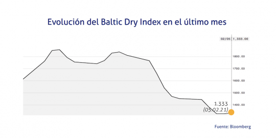 El Baltic Dry Index, BDI, que refleja los precios de los fletes de los buques graneleros tomando como referencia un total de 23 rutas marítimas, se ha situado el 5 de febrero de 2021 en los 1.333 puntos, lo que supone un incremento de seis puntos o del 0,45% a lo largo de la jornada.