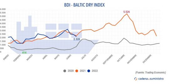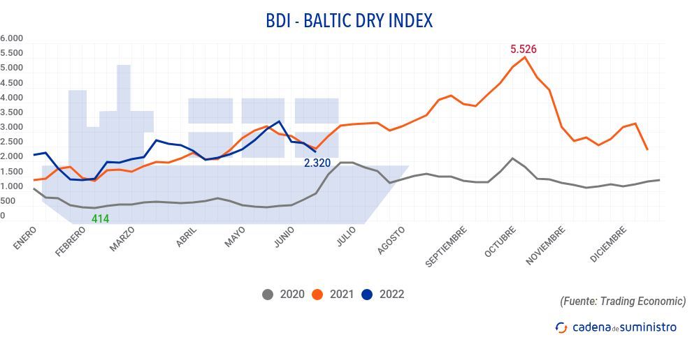 El Baltic Dry Index, BDI, que refleja los precios de los fletes de buques graneleros tomando como referencia 23 rutas marítimas, ha registrado el viernes 10 de junio de 2022 una caída de 22 puntos hasta los 2.320.