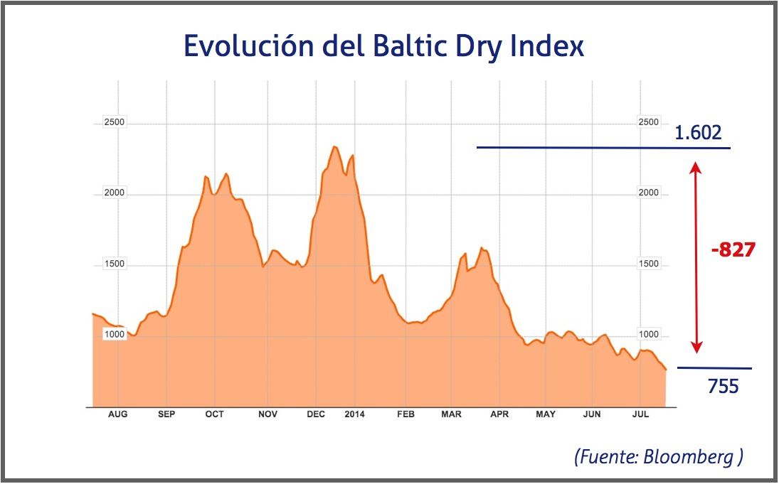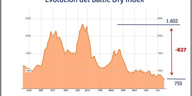 El 16 de julio, el Baltic Dry Index ha bajado hasta los 755 puntos, después de que a finales de marzo se registraran 1.602. En comparación, esto supone una caída del 53%, aunque el descenso más fuerte se produjo entre el 24 de marzo y el 17 de abril, que fue del 58%. A pesar de que, entre abril y julio, se hayan ido alternando subidas y bajadas, el pico más alto entre los cuatro meses ha sido de 1.027. Por lo tanto, en el primer semestre de 2014, es decir, entre enero y junio, la caída ha sido del 55%.