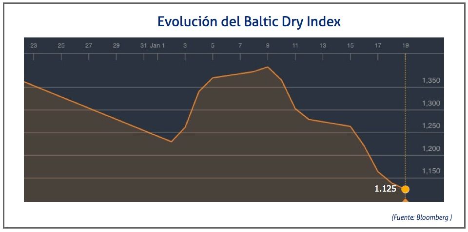El Baltic Dry Index, BDI, que refleja los precios de los fletes de los buques graneleros tomando como referencia 23 rutas marítimas, ha caído el 19 de enero de 2018 hasta los 1.125 puntos, lo que supone un descenso de 14 puntos o del 1,23% respecto al registro anterior.