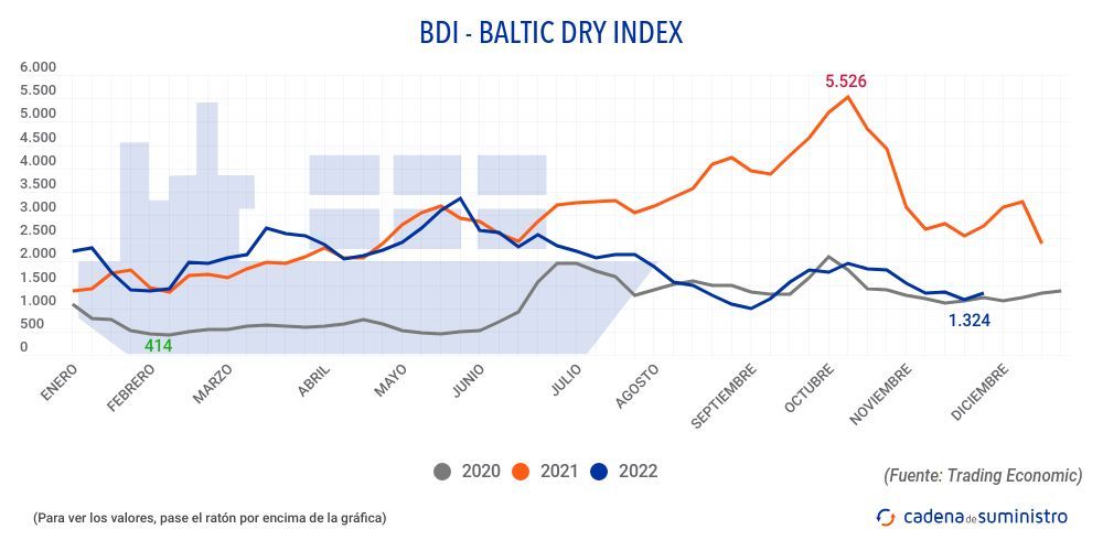 El Baltic Dry Index, BDI, que refleja los precios de los fletes de buques graneleros tomando como referencia 23 rutas marítimas, ha registrado el viernes 25 de noviembre de 2022 un aumento de 82 puntos o un 6,6% hasta los 1.324, llegando el incremento a un 11,4% a nivel semanal.