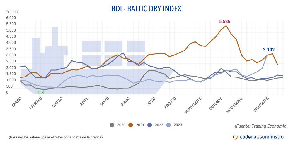 El Baltic Dry Index, BDI, que refleja los precios de los fletes de buques graneleros tomando como referencia 23 rutas marítimas, ha anotado un incremento de 255 puntos o un 8,7% en la jornada del viernes 1 de diciembre, hasta los 3.192 puntos. Esto supone un ascenso del 52% a nivel semanal.