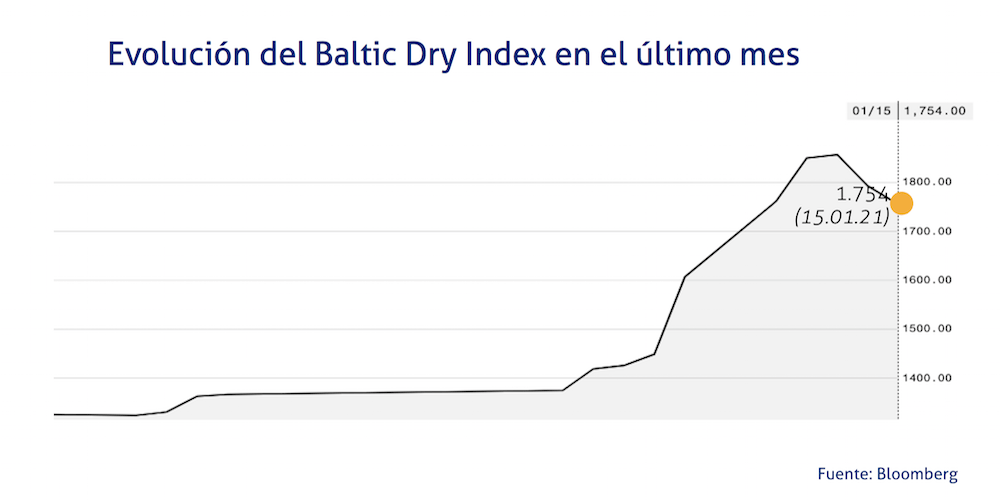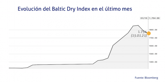 El Baltic Dry Index, BDI, que refleja los precios de los fletes de los buques graneleros tomando como referencia un total de 23 rutas marítimas, se ha situado el 15 de enero de 2021 en los 1.754 puntos, lo que supone un descenso de 38 puntos o del 2,12% a lo largo de la jornada.