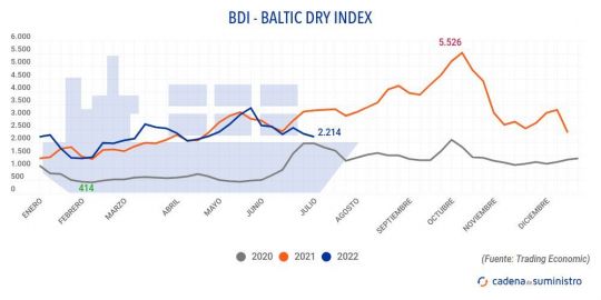 El Baltic Dry Index, BDI, que refleja los precios de los fletes de buques graneleros tomando como referencia 23 rutas marítimas, ha registrado el viernes 30 de junio de 2022 un descenso de 26 puntos o un 1,2% hasta los 2.214. Durante la semana, se ha registrado una caída del 5%.