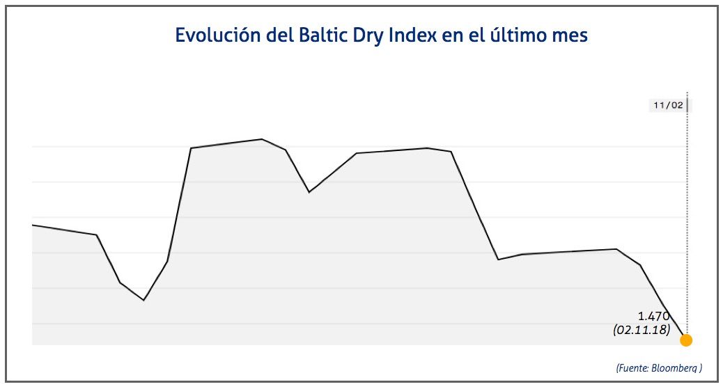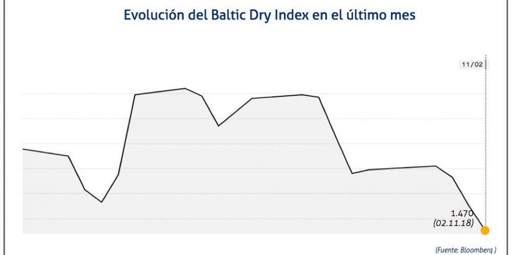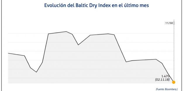El Baltic Dry Index, BDI, que refleja los precios de los fletes de los buques graneleros tomando como referencia un total de 23 rutas marítimas, ha retrocedido el viernes 2 de noviembre de 2018 hasta los 1.470 puntos, lo que supone un descenso de 20 puntos o del 1,34%.