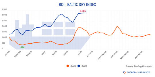 El Baltic Dry Index, BDI, que refleja los precios de los fletes de los buques graneleros tomando como referencia un total de 23 rutas marítimas, se ha situado el viernes 2 de julio de 2021 en los 3.285 puntos.
