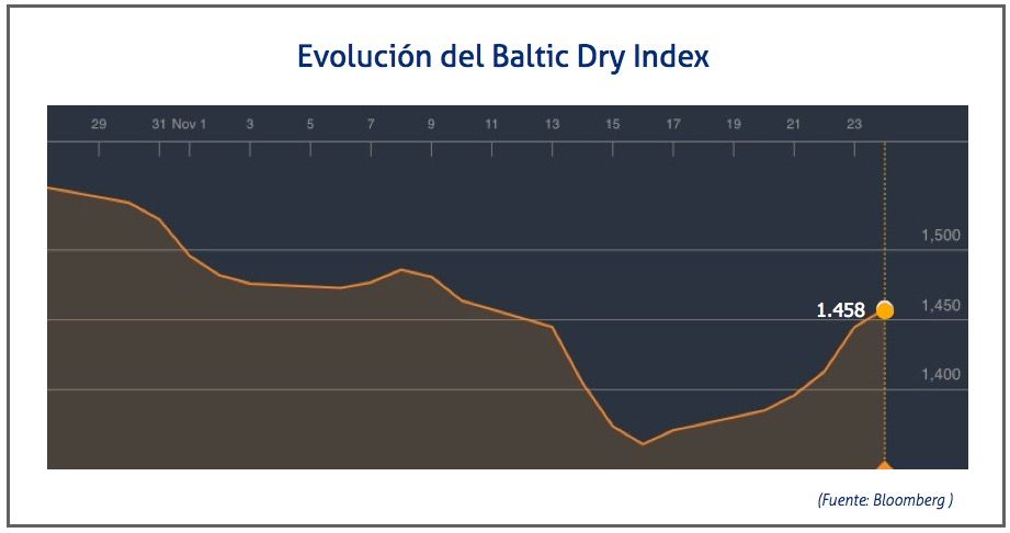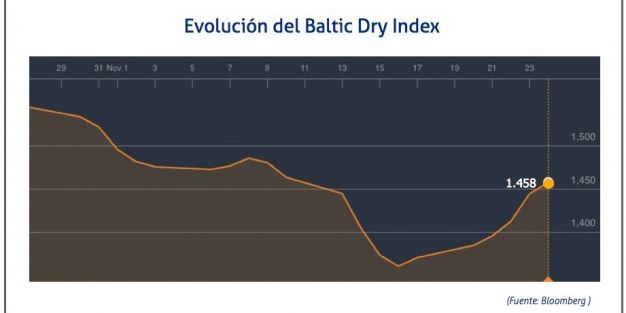 El Baltic Dry Index, BDI, que refleja los precios de los fletes de los buques graneleros tomando como referencia 23 rutas marítimas, ha aumentado el 24 de noviembre de 2017 hasta los 1.458 puntos, lo que supone un ascenso de 13 puntos o del 0,9%.