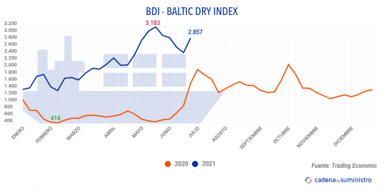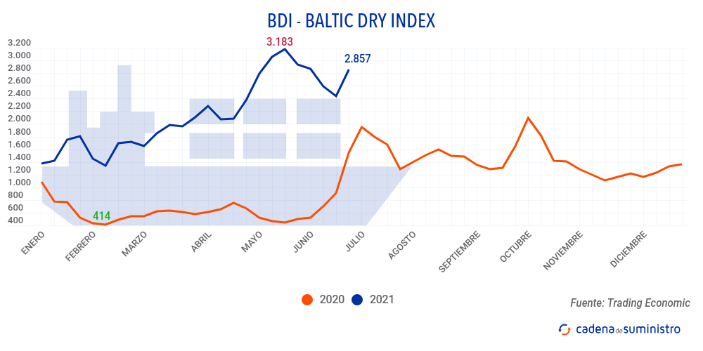 El Baltic Dry Index, BDI, que refleja los precios de los fletes de los buques graneleros tomando como referencia un total de 23 rutas marítimas, se ha situado el viernes 11 de junio de 2021 en los 2.857 puntos. La cifra supone un incremento de 188 puntos o del 7% durante la jornada, y del 17% a lo largo de la semana.