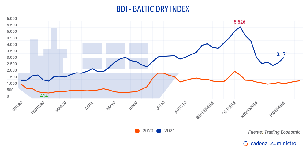 El Baltic Dry Index, BDI, que refleja los precios de los fletes de buques graneleros tomando como referencia 23 rutas marítimas, se ha situado el viernes 3 de diciembre en los 3.171 puntos, lo que representa un incremento de 56 puntos o de un 1,8% durante la jornada. No obstante, a lo largo de la semana ha ganado un 14,6%, el mayor aumento desde la semana del 20 de agosto.