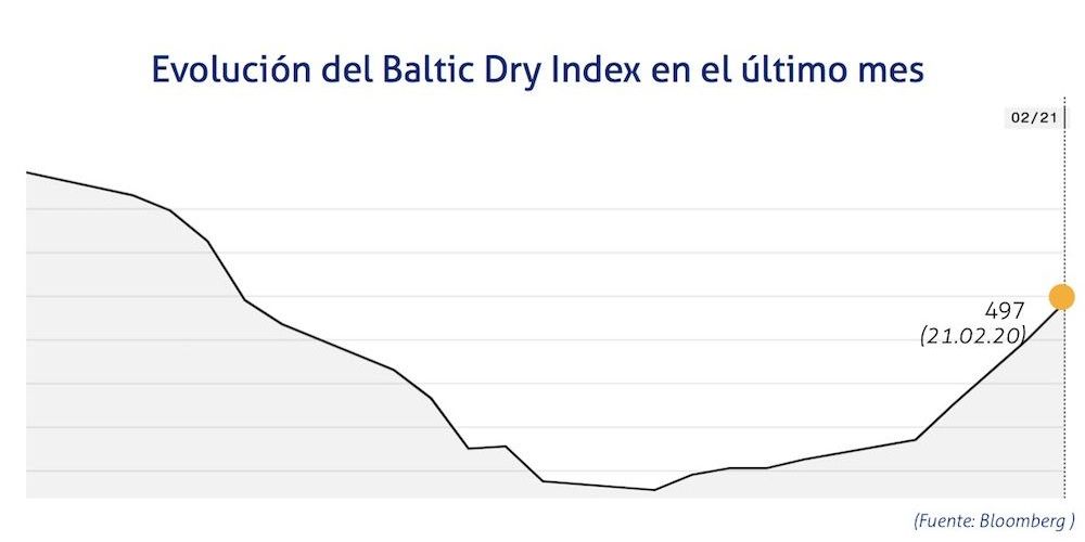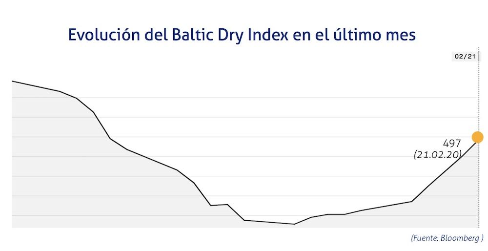 El Baltic Dry Index, BDI, que refleja los precios de los fletes de los buques graneleros tomando como referencia un total de 23 rutas marítimas, se ha situado el viernes 21 de febrero de 2020 en los 497 puntos, lo que supone un incremento de 17 puntos o del 3,54%.
