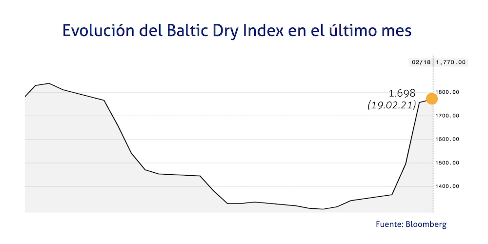 El Baltic Dry Index, BDI, que refleja los precios de los fletes de los buques graneleros tomando como referencia un total de 23 rutas marítimas, se ha situado el 19 de febrero de 2021 en los 1.698 puntos, lo que supone 72 puntos o un 4,1% menos.