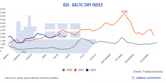 El Baltic Dry Index, BDI, que refleja los precios de los fletes de buques graneleros tomando como referencia 23 rutas marítimas, ha registrado el viernes 6 de mayo de 2022 un incremento de 74 puntos o del 2,8% hasta los 2.718. Esto supone además un aumento del 13,1% durante la última semana.