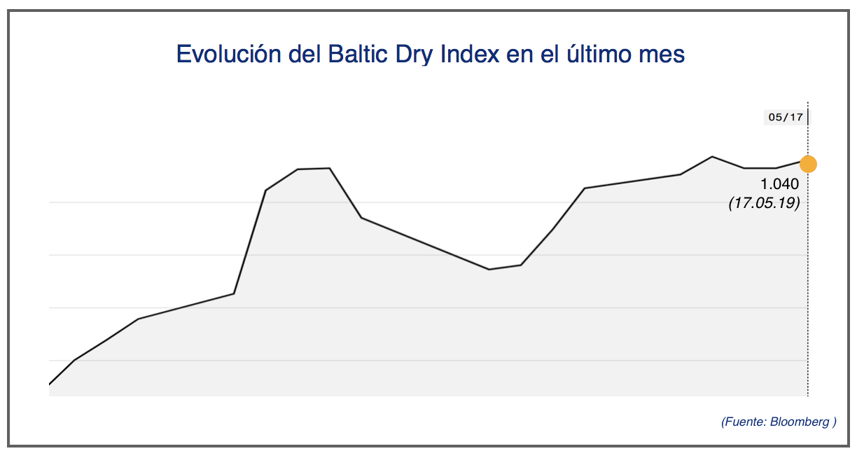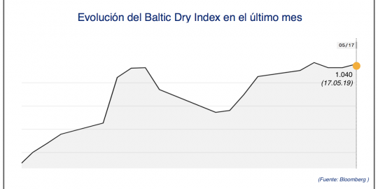 El Baltic Dry Index, BDI, que refleja los precios de los fletes de los buques graneleros tomando como referencia un total de 23 rutas marítimas, se ha situado el viernes 17 de mayo de 2019 en los 1.040 puntos, lo que supone un aumento de ocho puntos, que equivale a un 0,78%.
