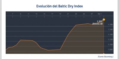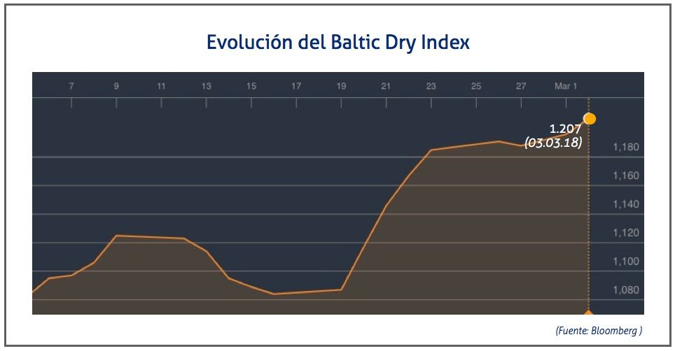 El Baltic Dry Index, BDI, que refleja los precios de los fletes de los buques graneleros tomando como referencia 23 rutas marítimas, ha caído el viernes día 3 de marzo de 2018 hasta los 1.207 puntos, lo que supone un aumento de 11 puntos o del 0,92%, con incrementos en todos los segmentos salvo el de los panamax.