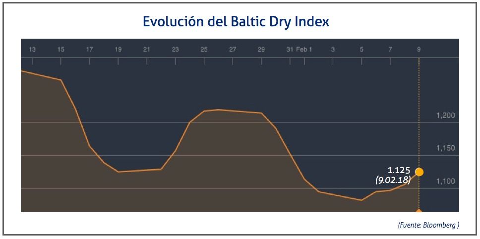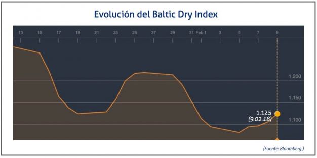 El Baltic Dry Index, BDI, que refleja los precios de los fletes de los buques graneleros tomando como referencia 23 rutas marítimas, ha caído el viernes 9 de febrero de 2018 hasta los 1.125 puntos, lo que supone un incremento de 19 puntos o del 1,72%, al que han contribuido todos los segmentos.