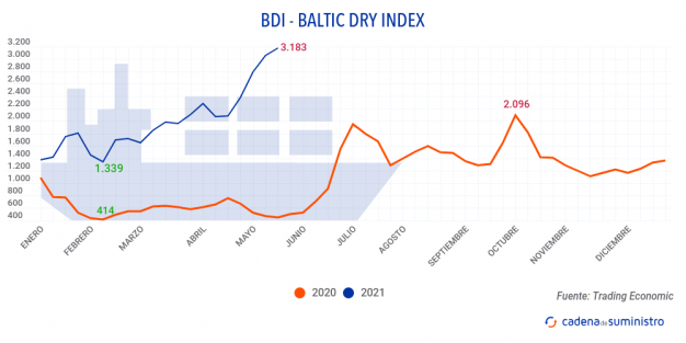 El Baltic Dry Index, BDI, que refleja los precios de los fletes de los buques graneleros tomando como referencia un total de 23 rutas marítimas, se ha situado el viernes 7 de mayo de 2021 en los 3.183 puntos, lo que supone una caída de 29 puntos o del 0,9% durante la jornada.