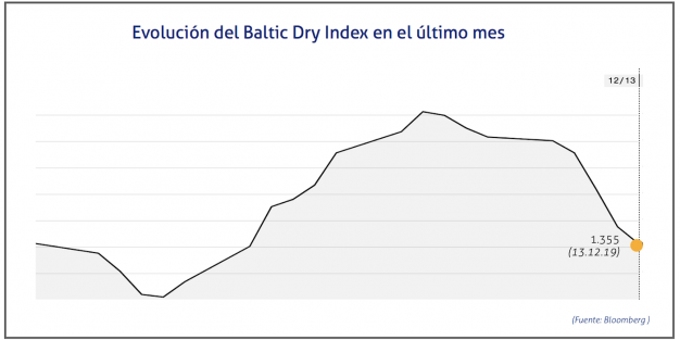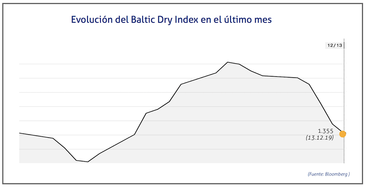 El Baltic Dry Index, BDI, que refleja los precios de los fletes de los buques graneleros tomando como referencia un total de 23 rutas marítimas, se ha situado el viernes 13 de diciembre de 2019 en los 1.355 puntos, lo que supone una caída de 33 puntos o del 2,38%.