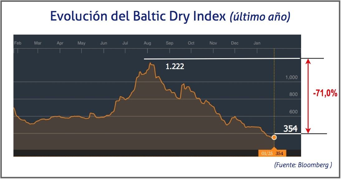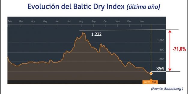 El Baltic Dry Index continúa descendiendo y ya se encuentra en los 354 puntos, un índice que, sin embargo, se ha mantenido durante dos días. Esto supone un 71% menos que la cifra más alta entre enero de 2015 y enero de 2016, que fue de 1.222 puntos, alcanzada el 5 de agosto de 2015.