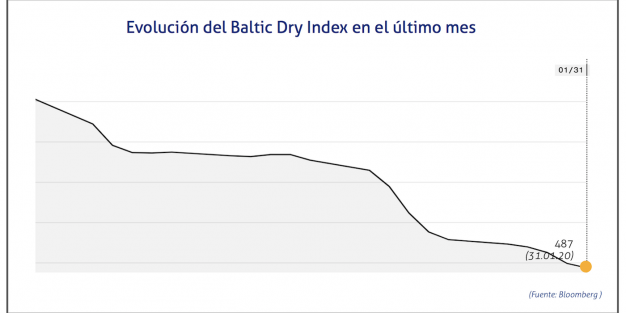 El Baltic Dry Index, BDI, que refleja los precios de los fletes de los buques graneleros tomando como referencia un total de 23 rutas marítimas, se ha situado el viernes 31 de enero de 2020 en los 487 puntos, lo que supone un descenso de 12 puntos o del 2,21%.