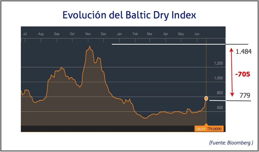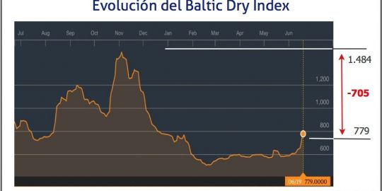 El Baltic Dry Index ha alcanzado los 779 puntos el 19 de junio, una subida espectacular en comparación con el registro de unos días antes, en los que rondaba los 642 puntos. Esta progresión ha supuesto una subida del 21%.