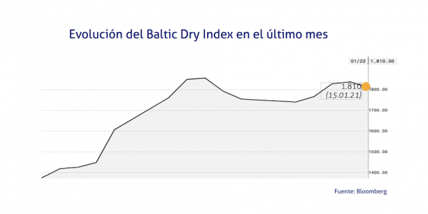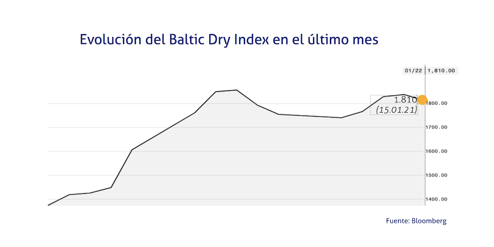El Baltic Dry Index, BDI, que refleja los precios de los fletes de los buques graneleros tomando como referencia un total de 23 rutas marítimas, se ha situado el 22 de enero de 2021 en los 1.810 puntos, lo que supone un descenso de 17 puntos o del 1,47% a lo largo de la jornada.