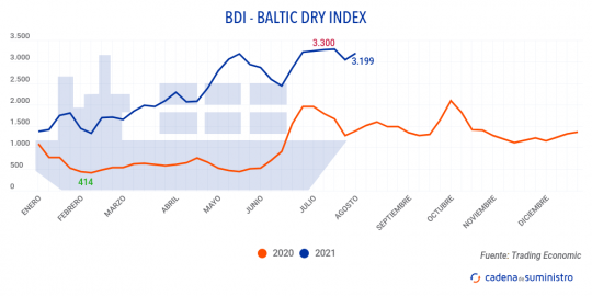 El Baltic Dry Index, BDI, que refleja los precios de los fletes de los buques graneleros tomando como referencia un total de 23 rutas marítimas, se ha situado el viernes 23 de julio de 2021 en los 3.199 puntos. Esto supone un aumento de 96 puntos o del 3,1% durante la última jornada y del 5,3% a nivel semanal.