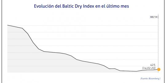 El Baltic Dry Index, BDI, que refleja los precios de los fletes de los buques graneleros tomando como referencia un total de 23 rutas marítimas, se ha situado el viernes 14 de febrero de 2020 en los 425 puntos, lo que supone un incremento de cuatro puntos o del 0,95%. Desde el día 16 de enero, cuando llegó a los 768 puntos, ya ha perdido un 80%.