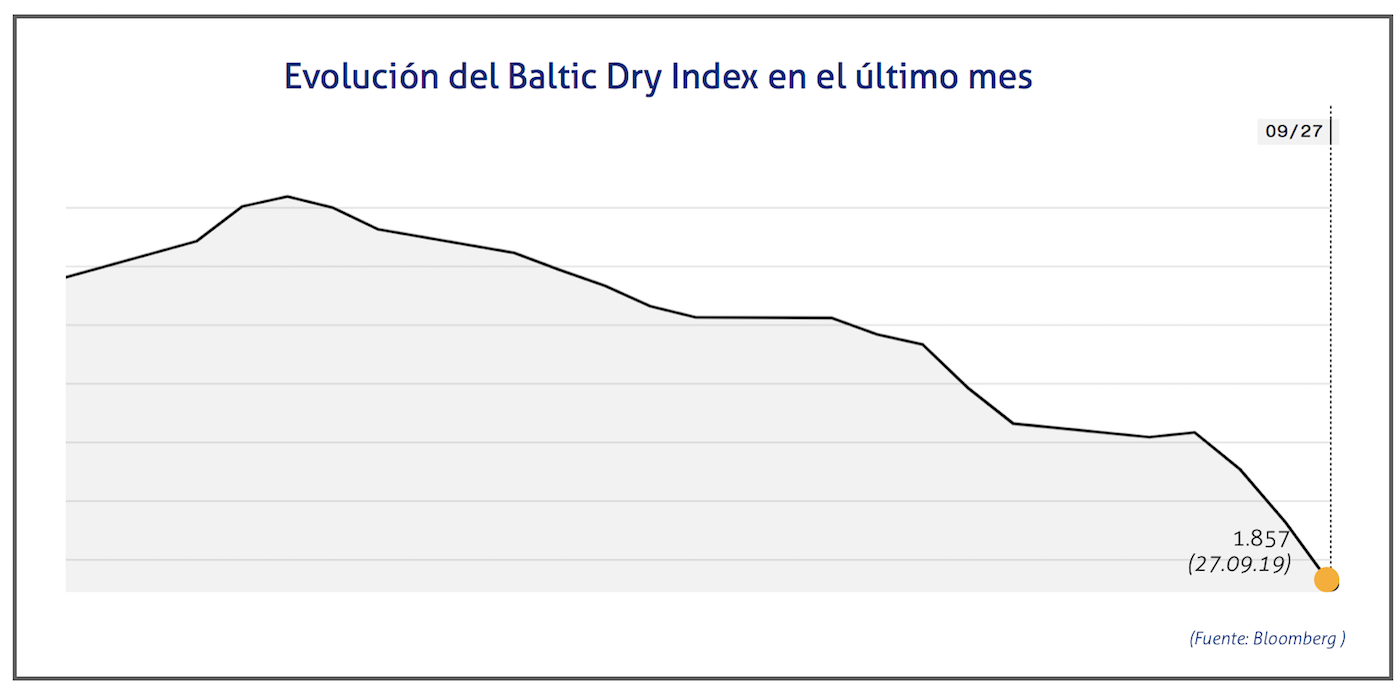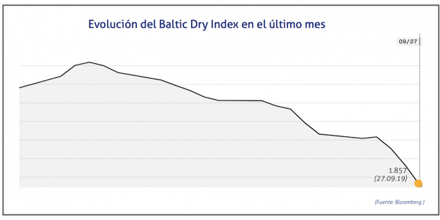 El Baltic Dry Index, BDI, que refleja los precios de los fletes de los buques graneleros tomando como referencia un total de 23 rutas marítimas, se ha situado el viernes 27 de septiembre de 2019 en los 1.857 puntos, lo que supone un descenso de 106 puntos o del 5,4%.