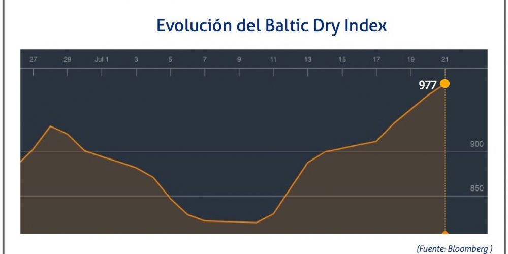 El Baltic Dry Index, BDI, que refleja los precios de los fletes de los buques graneleros tomando como referencia 23 rutas marítimas, ha aumentado el 21 de julio de 2017 hasta los 977 puntos, lo que supone un incremento de 13 puntos o del 1,35% respecto al registro anterior, un día antes. Se trata de su nivel más elevado desde mediados de mayo.
