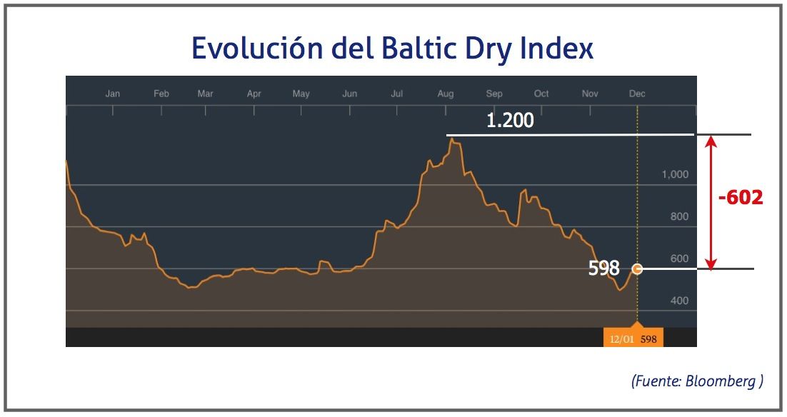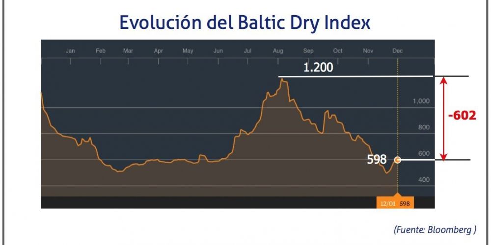 Con un índice de 598, el Baltic Dry Index, que mide el precio de los fletes marítimos, ha conseguido remontar parcialmente, la caída de los meses precedentes, en la que llegó a marcar su mínimo histórico, un valor de 498 puntos, el pasado 22 de noviembre. Esto supone un aumento del 20%.