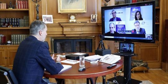 El Rey Felipe VI ha mantenido una videoconferencia con representantes del Centro Español de Logística para analizar las consecuencias que ha tenido la crisis del Covid-19 en el sector y las medidas que es necesario adoptar para garantizar la competitividad y la eficiencia durante la salida de la crisis.