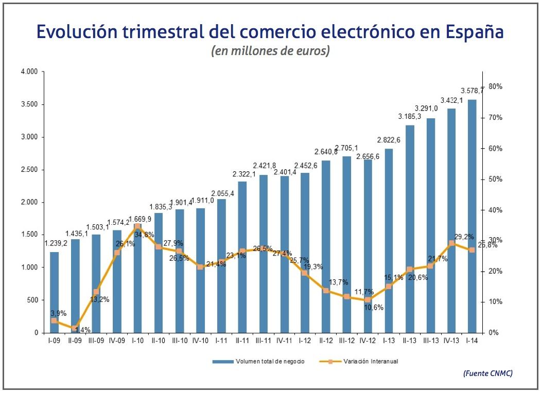 La facturación total del comercio electrónico ha alcanzado los 3.579 millones de euros en el primer trimestre de 2014, un 27% más en tasa interanual, según se desprende del "Informe sobre el comercio electrónico en España a través de entidades de medios de pago (1er Trimestre 2014)", publicado por la CNMC.
