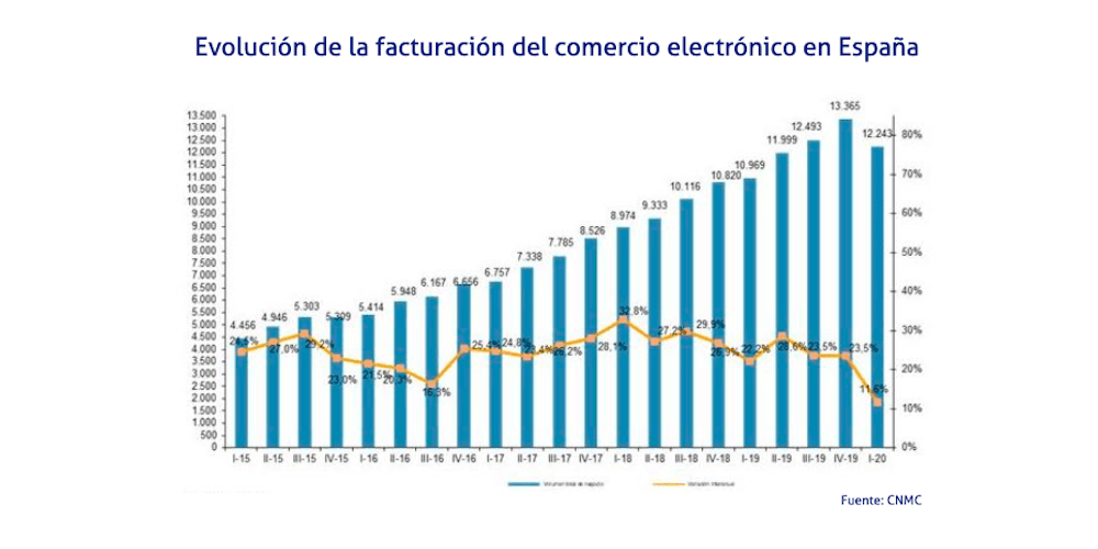 La facturación del comercio electrónico en España ha aumentado en el primer trimestre de 2020 un 11,6% interanual hasta alcanzar los 12.243 millones de euros, según los registros de la Comisión Nacional de los Mercados y la Competencia.