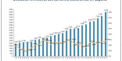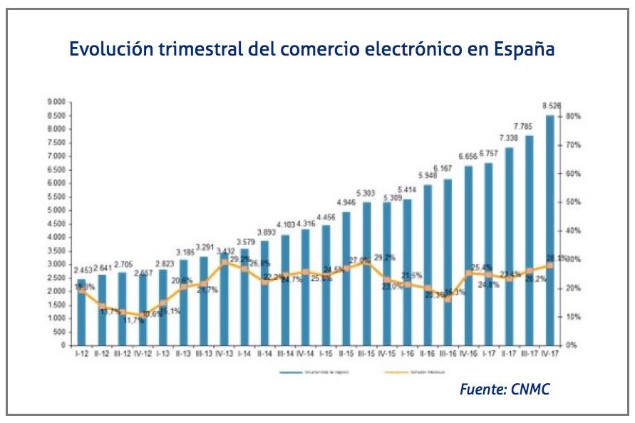 La facturación del comercio electrónico en España ha aumentado en el cuarto trimestre de 2017 un 28,1% interanual hasta alcanzar los 8.526 millones de euros, según los últimos datos de comercio electrónico disponibles en el portal CNMCData.