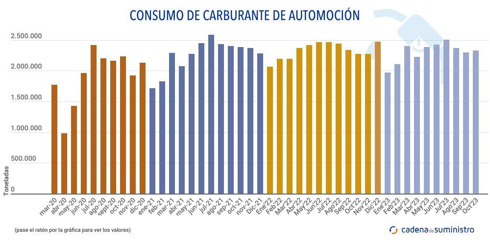 El consumo de carburantes de automoción se ha incrementado un 2,4% en España en el décimo mes de 2023, alcanzando las 2.331.000 toneladas, según el último informe de Cores. Hasta octubre, ha retrocedido en un 0,6% hasta las 23.033.000 toneladas.