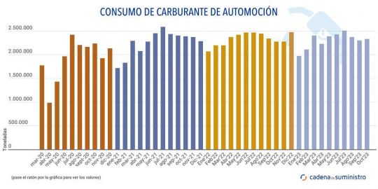 Por su parte, el consumo de gasolinas se ha incrementado en un 8,7% hasta las 522.000 toneladas, y en un 6,4% desde enero, con un total de 5.078.000 toneladas.