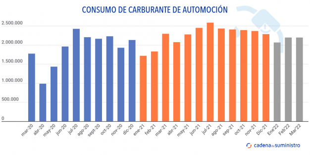 Por productos, el consumo del gasóleo A ha caído un 6,6% en marzo, con un total de 1.756.000 toneladas, mientras que en lo que va de año, ha aumentado en un 7,8% hasta las 5.209.000.