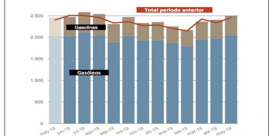 Mientras, el consumo de gasolinas, que presenta un mejor comportamiento que el gasóleo desde junio de 2018, ha aumentado un 6,1% a nivel mensual, alcanzando las 455.000 toneladas. La cifra se eleva 2.082.000 desde el inicio del año, un 6,2% más.