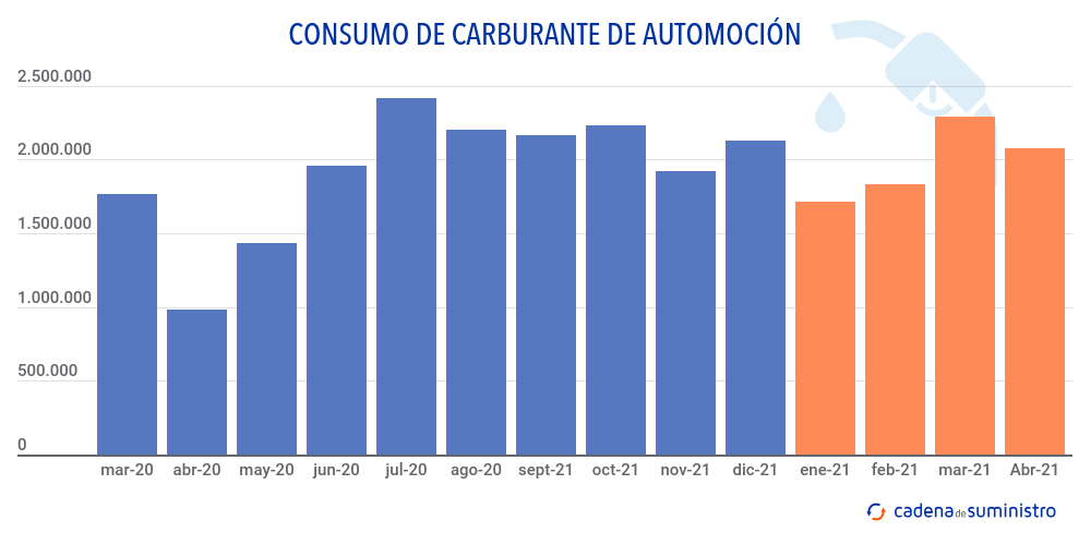 En abril de 2021, el consumo de carburantes de automoción en España se ha incrementado en un 110,6%, llegando a las 2.074.000 toneladas, según el último informe de Cores, pues en el mismo mes de 2020 se registró el mínimo anual. En el acumulado, el aumento ha sido del 8,9%, con 7.906.000 toneladas.