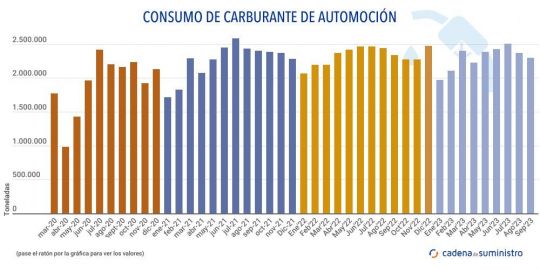 El consumo de carburantes de automoción se ha reducido un 1,6% en España en el noveno mes de 2023, alcanzando las 2.296.000 toneladas, según el último informe de Cores. Hasta septiembre, ha retrocedido en un 1% hasta las 20.703.000 toneladas.