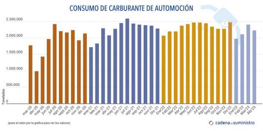 Por productos, el consumo del gasóleo A se ha reducido en un 8,4% en abril respecto al mismo mes del año anterior, con un total de 1.736.000 toneladas, y un 3% en estos cuatro primeros meses, con 6.889.000 toneladas.
