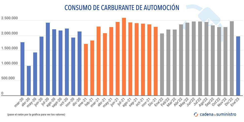 Por productos, el consumo del gasóleo A ha caído un 6,2% en enero respecto al mismo mes del año anterior, con un total de 1.569.000 toneladas, y un 19,3% en comparación con el último mes de 2022.