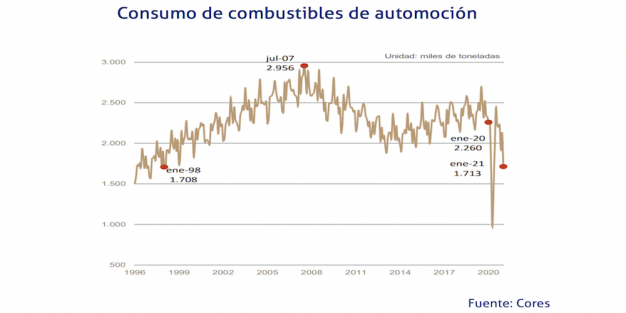 En enero de 2021, el consumo de carburantes de automoción en España se ha reducido un 24,2%, llegando a las 1.713.000 toneladas, según el informe de Cores. Esto supone el menor consumo para un mes de enero desde el año 1998.