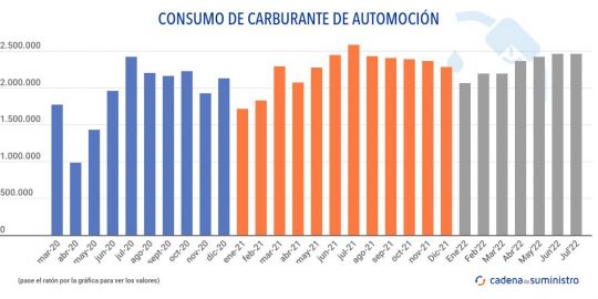 En cuanto al consumo de gasolinas, ha caído un 1% a nivel mensual hasta las 534.000 toneladas, aunque desde enero el ascenso ha sido del 14% hasta las 3.228.000 toneladas.