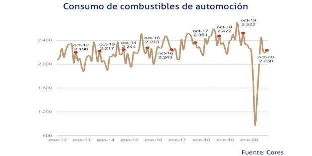 En el mes de octubre de 2020, el consumo de carburantes de automoción en España ha caído un 11,5%, llegando a las 2.230.000 toneladas, según el informe de Cores, situándose el retroceso en el acumulado en un 18,3%, con 19.742.000 toneladas.