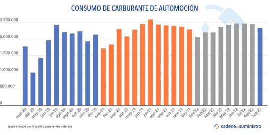 El consumo de carburantes de automoción ha caído un 2,9% en España en el noveno mes de 2022, alcanzando las 2.334.000 toneladas, según el último informe de Cores. Esto, por otro lado, eleva el acumulado anual a 20.904.000 toneladas, un 4,3% más.