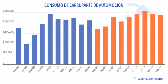 En septiembre de 2021, el consumo de carburantes de automoción en España se ha incrementado en un 9,5%, llegando a las 2.403.000 toneladas, según el último informe de Cores. En el acumulado, el aumento ha sido del 14,5%, con 20.040.000 toneladas.