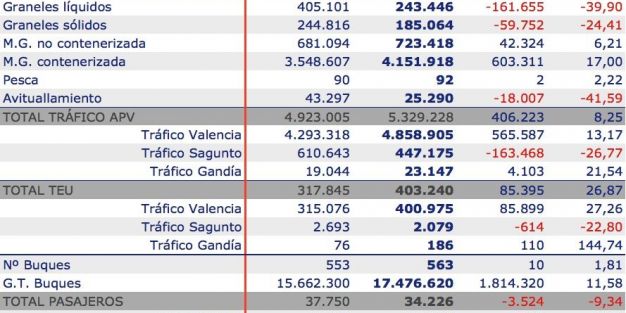 Por lo que respecta al tráfico de vehículos, en enero de 2015, los puertos de Valencia y Sagunto han canalizado un total de 44.319 automóviles, un 46,58% más que en enero de 2014. Asimismo, el tráfico ro-ro registra un incremento de un 13,44% hasta los 568.671 tn.